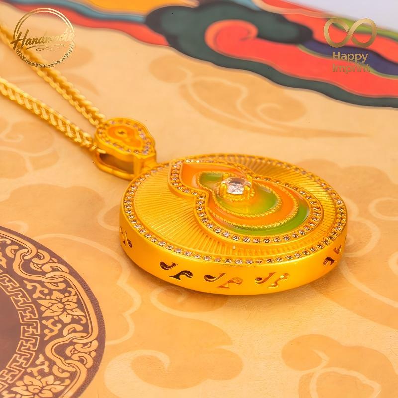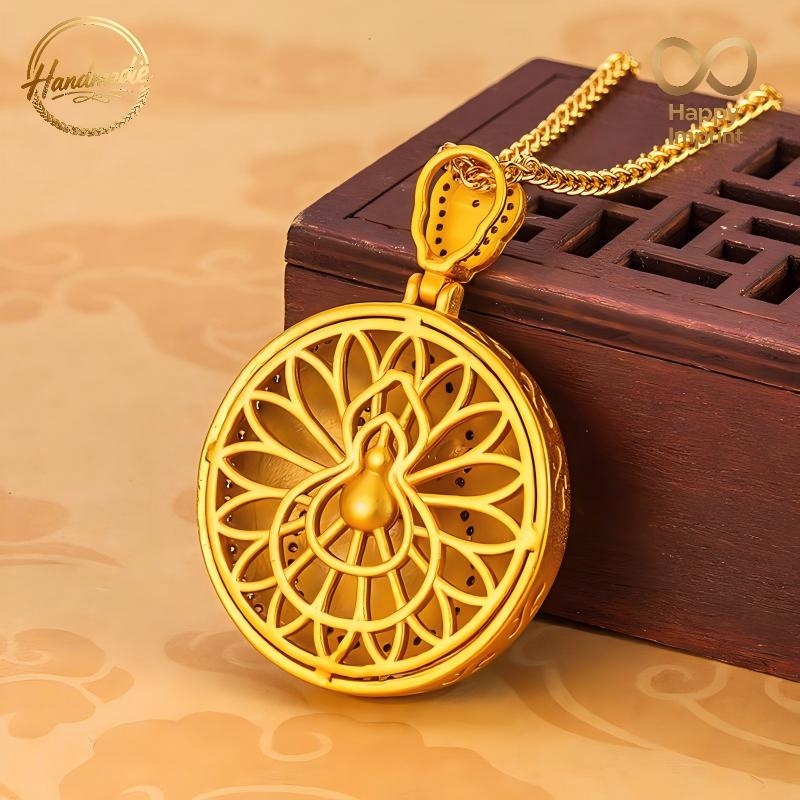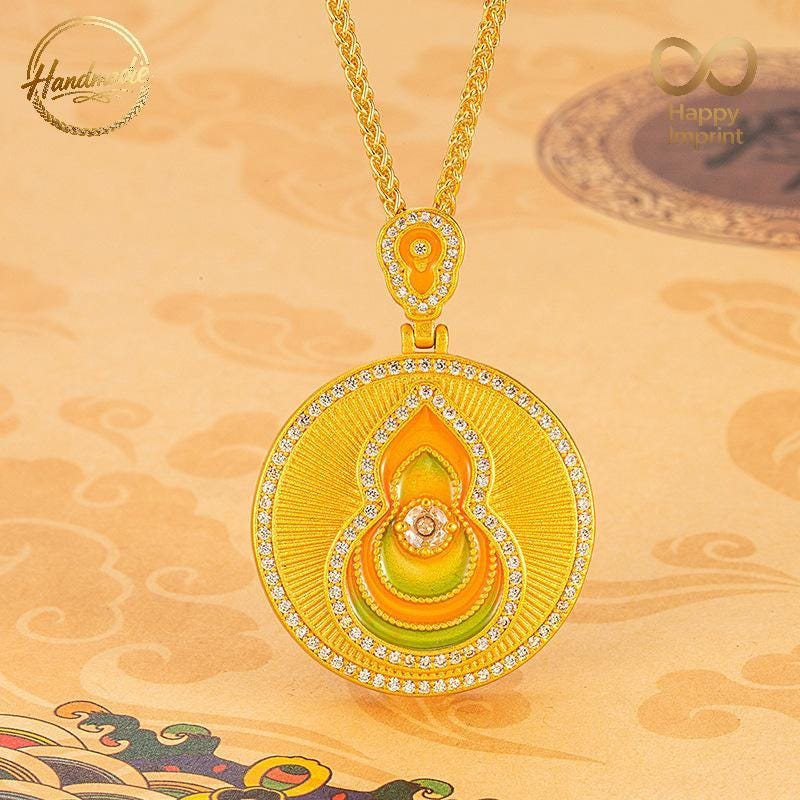 Star Seller Bestseller! Handmade Enamel Diamond-Accented Filigree Gold-Plated Amulet Gourd Pendant Necklace – A round design lined with simulated diamonds, centered with a vibrant orange-green gradient enamel gourd (a beloved good fortune symbol). It features a luxe diamond-accented clasp and an openable design (perfect for tucking in a tiny sachet!). This eye-catching, meaningful piece is ideal for elegant everyday wear or a thoughtful gift — don’t miss out on this fan-favorite treasure!